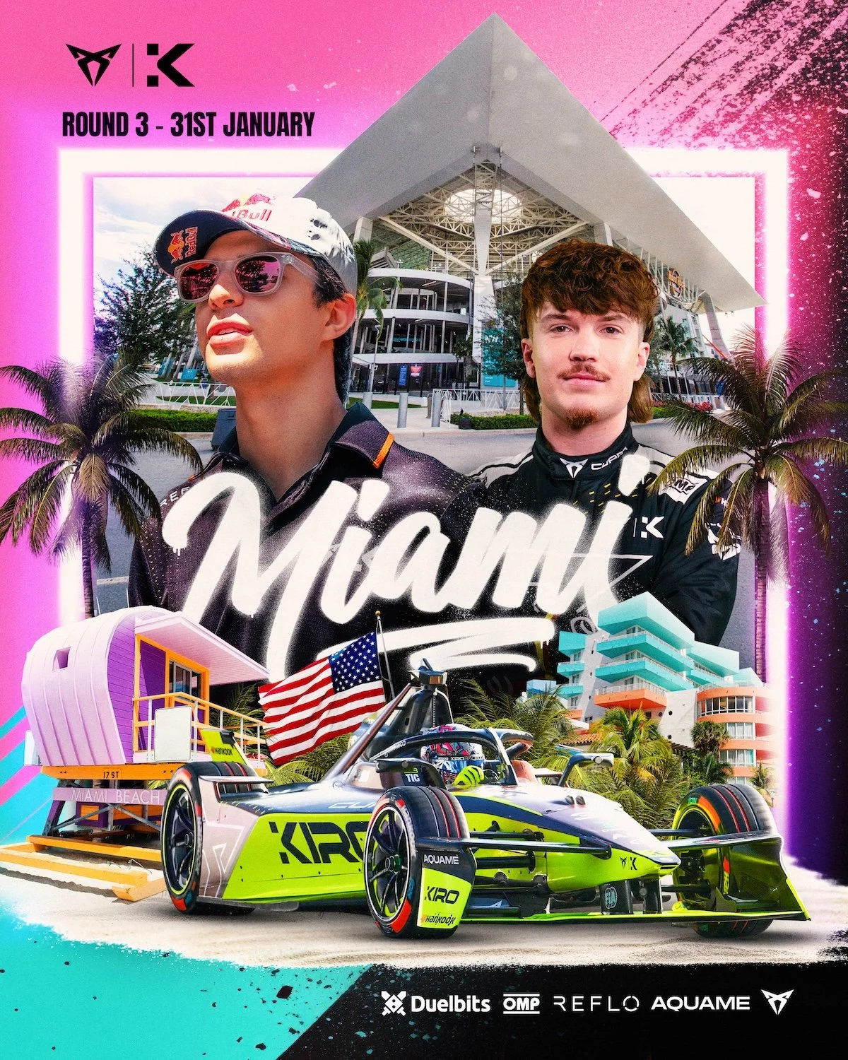 Follow CUPRA KIRO’s progress at home in Miami, with track action commencing on Friday 30 January with FP1 before the team takes on the third round of the 2025/26 Formula E season on Saturday, 31 January.